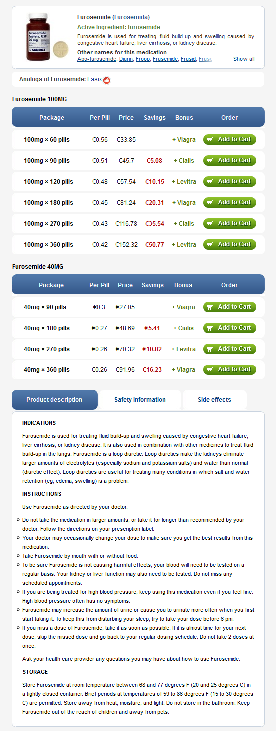 Før du starter denne behandling, kan du læse producentens trykte informationsfolder fra inde i din pakke. Producentens folder vil give dig mere information om furosemid og en komplet liste over bivirkninger, som du kan opleve fra at tage det.