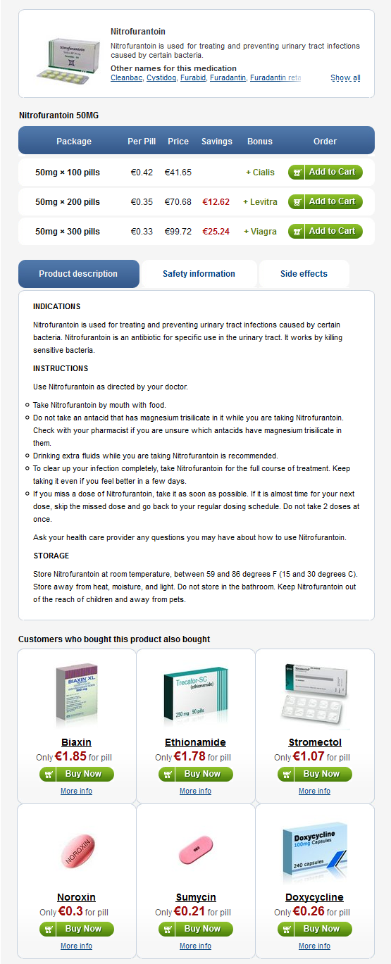 Antimikrobiel bredspektret nitrofuran derivat. Bakteriostatisk og baktericid virkning med urinvejsinfektioner. Nitrofurantoin er aktivt mod Escherichia coli, Klebsiella spp. Enterobacter spp. Proteus spp.