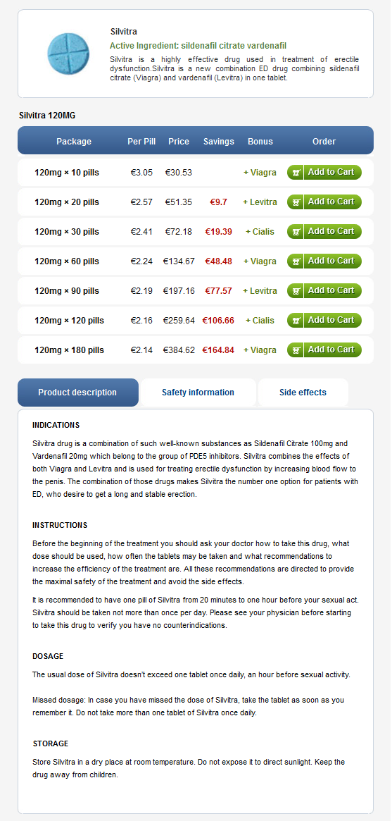 Silvitra er en ny kombinationsbehandling stof, herunder sådanne magtfulde erektil dysfunktion løsninger som Sildenafil og vardenafil hos sin forbindelse. Kombination af disse stoffer gør Silvitra nummer et for patienter med ED, der ønsker at få en lang og stabil erektion.